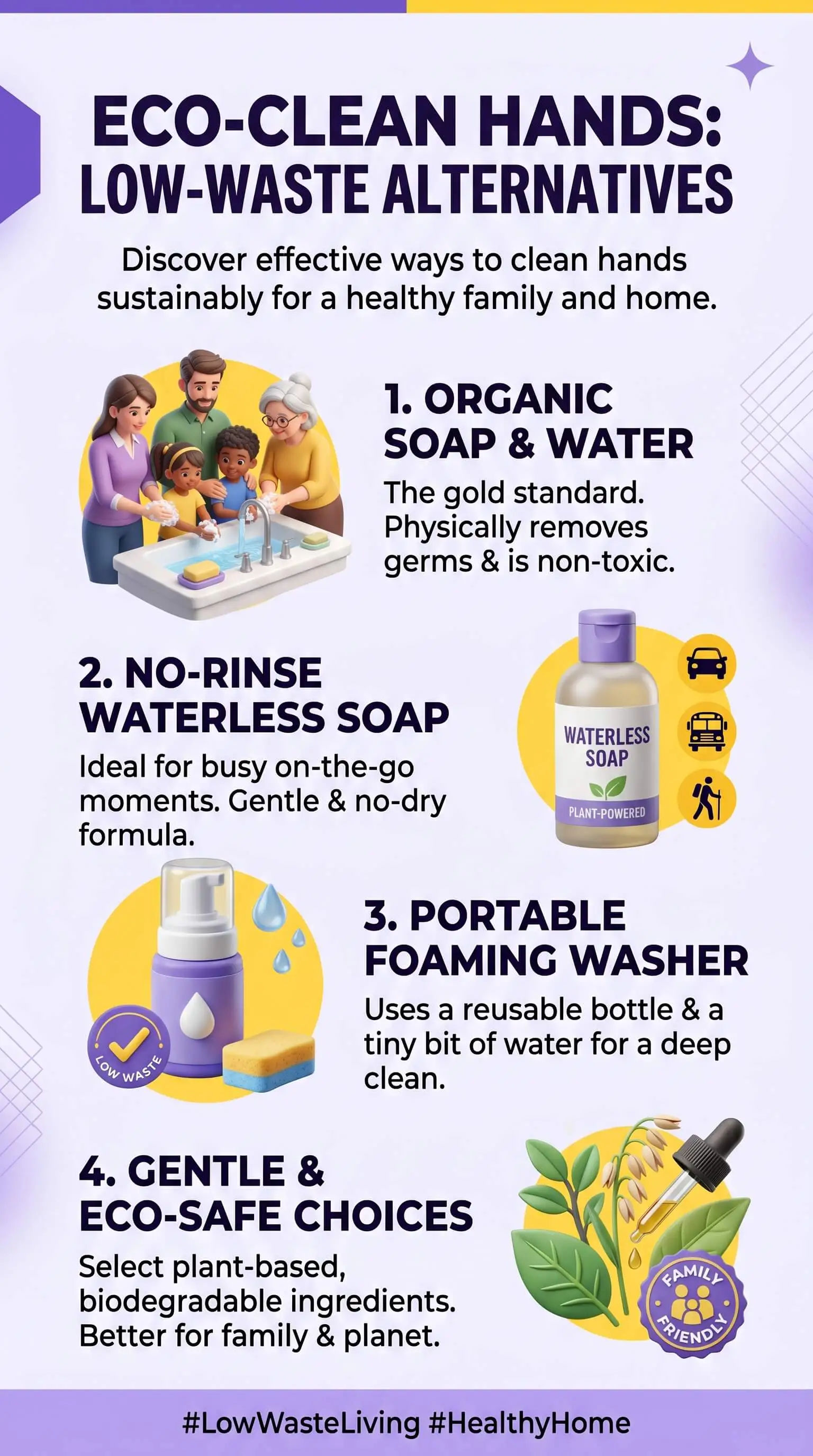 If someone asked me to pick one default for a household making the switch, I'd point to a refillable, plant-based foam soap kept by every sink, plus a small refillable bottle of waterless soap or low-waste sanitizer for the bag. That setup handles roughly 90% of daily hand-cleaning needs at a fraction of the packaging waste, and it's gentler on skin than the standard 70% alcohol gel.