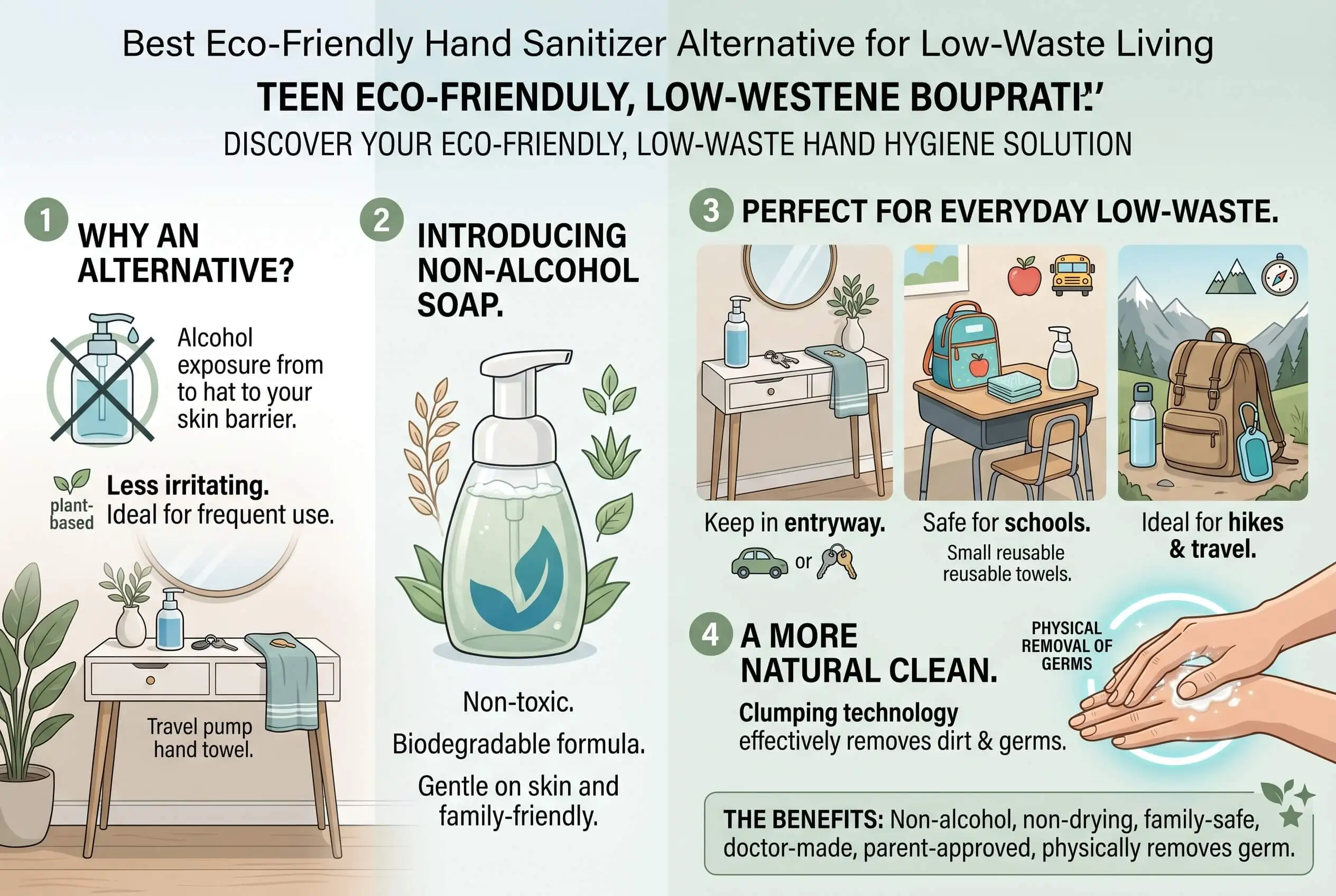 The most effective replacement is plain soap and water for at least 20 seconds whenever a sink is available. When you're on the move, the best alternatives are waterless soap (which doesn't need rinsing), plant-based foaming sanitizers in refillable bottles, or biodegradable hand wipes. Pick based on where you'll actually use the product, not which one looks best on the shelf.