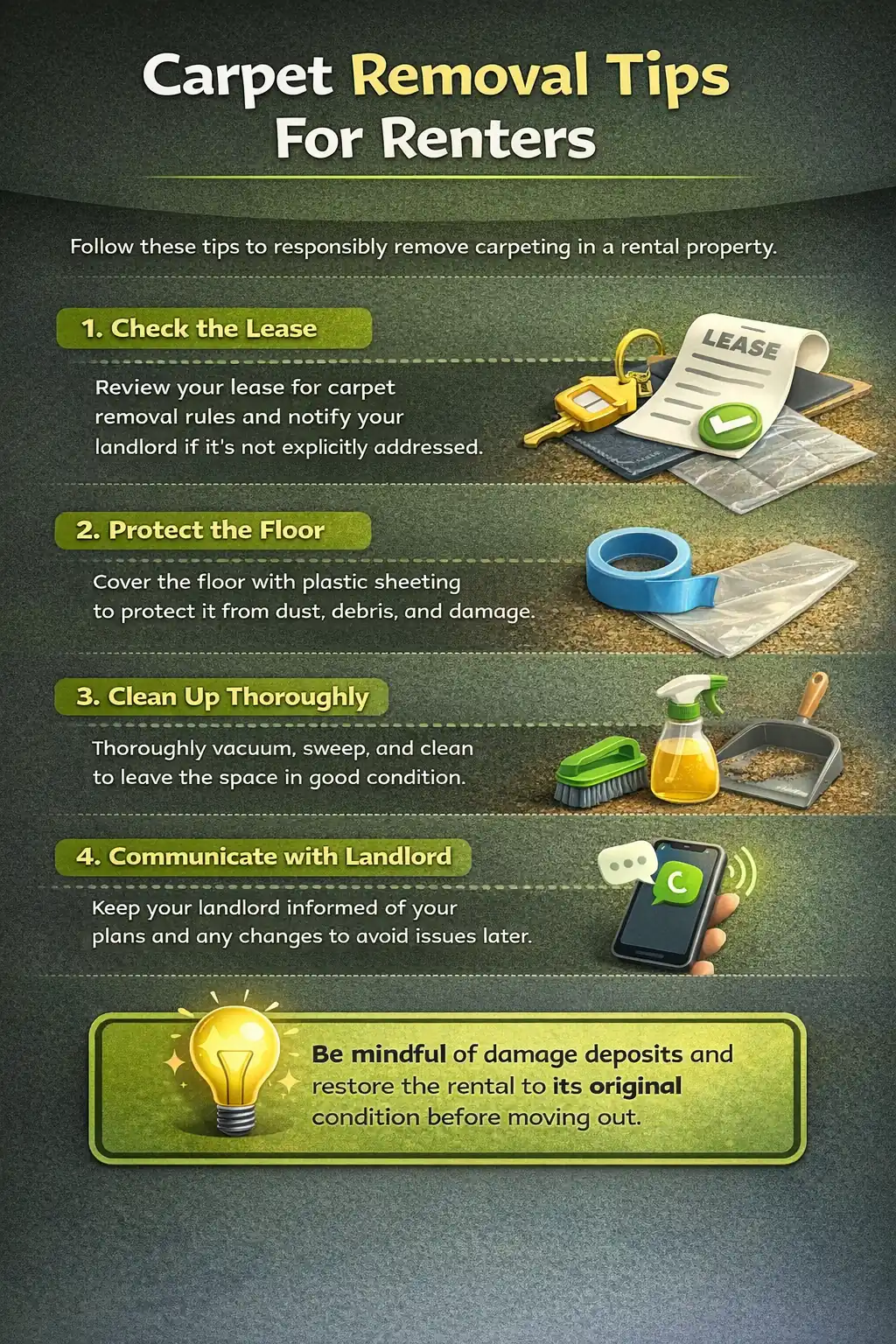 Removing carpet in a rental requires extra caution. Unlike homeowners, renters must protect the unit’s condition, follow lease rules, and avoid changes that can lead to deductions during move-out inspections. These tips focus on minimizing risk while still getting the job done correctly.