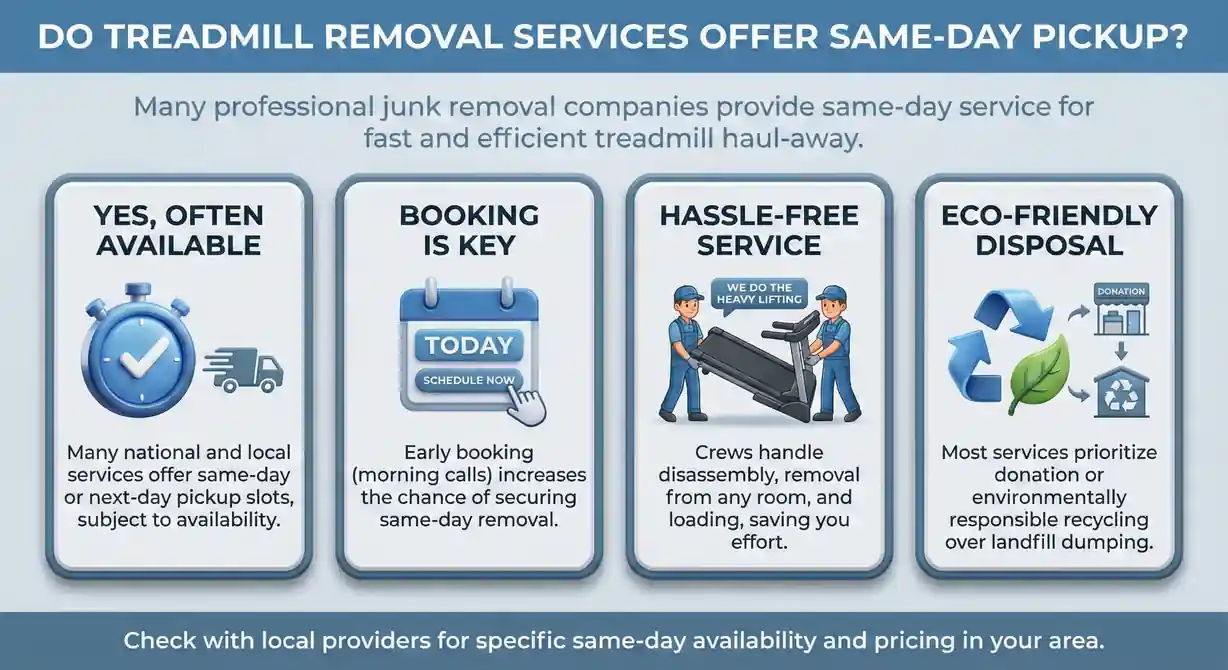 Yes, professional treadmill removal services offer same-day pickup. Availability depends on when you call, where you're located, and current job capacity. Early morning calls to services with multiple teams in your area have the best same-day success rates. Afternoon calls often require next-day scheduling.