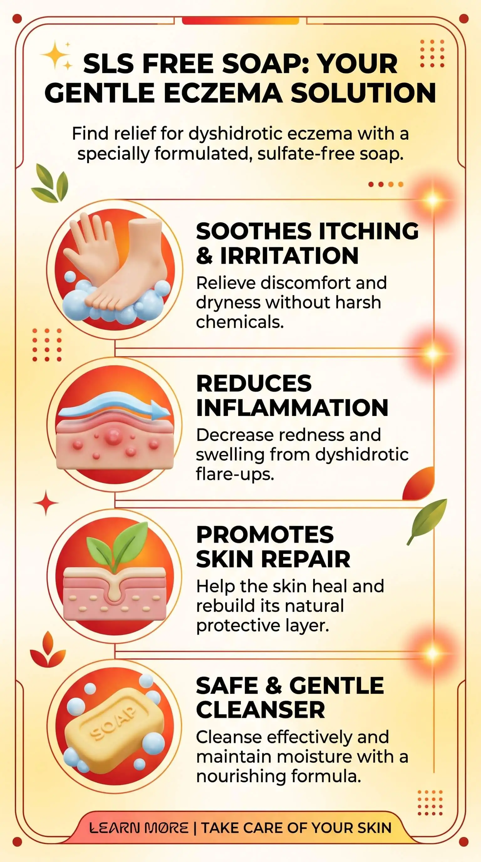 SLS free soap is any cleanser formulated without sodium lauryl sulfate, the anionic surfactant that strips the skin's lipid barrier. In home-care settings, it's the cheapest fix I've seen that delivers visible relief for dyshidrotic eczema on hands and feet, usually within 7 to 10 days of consistent use.