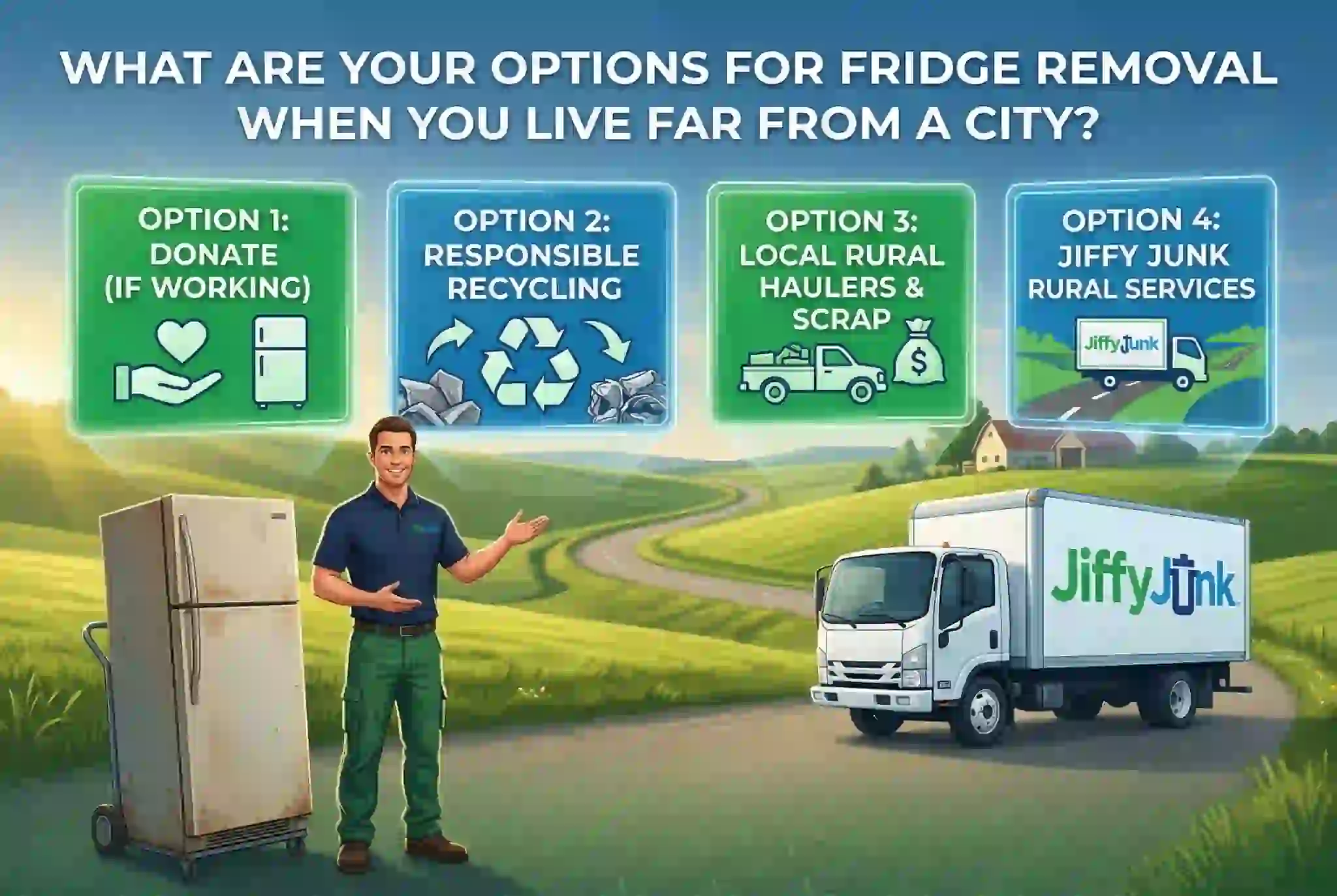 More options exist than most rural homeowners know. Retailer haul-away, utility recycling, scrap buyers, donation pickup, and full-service removal teams all reach beyond standard service zones. The gap is awareness — not availability.