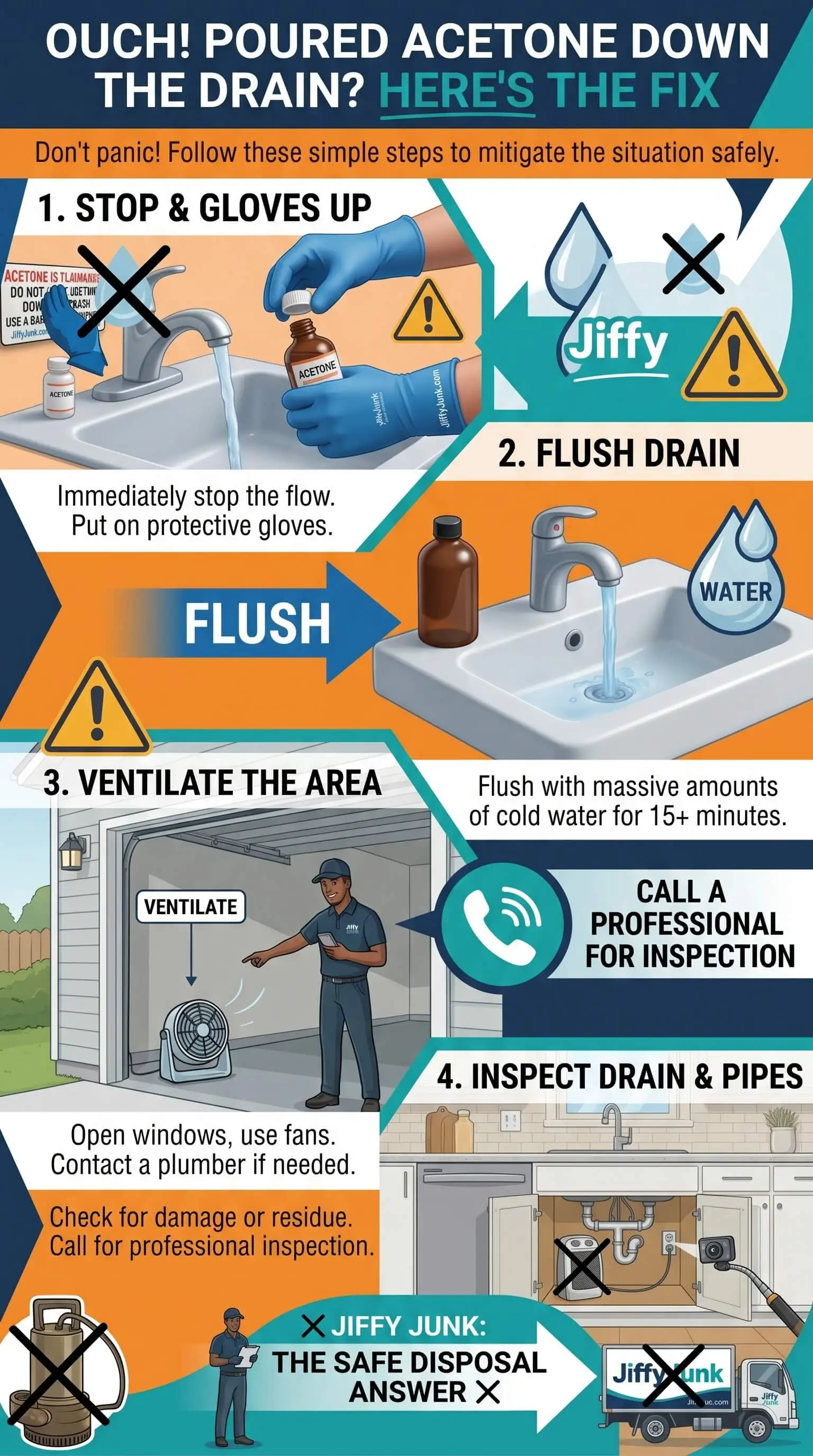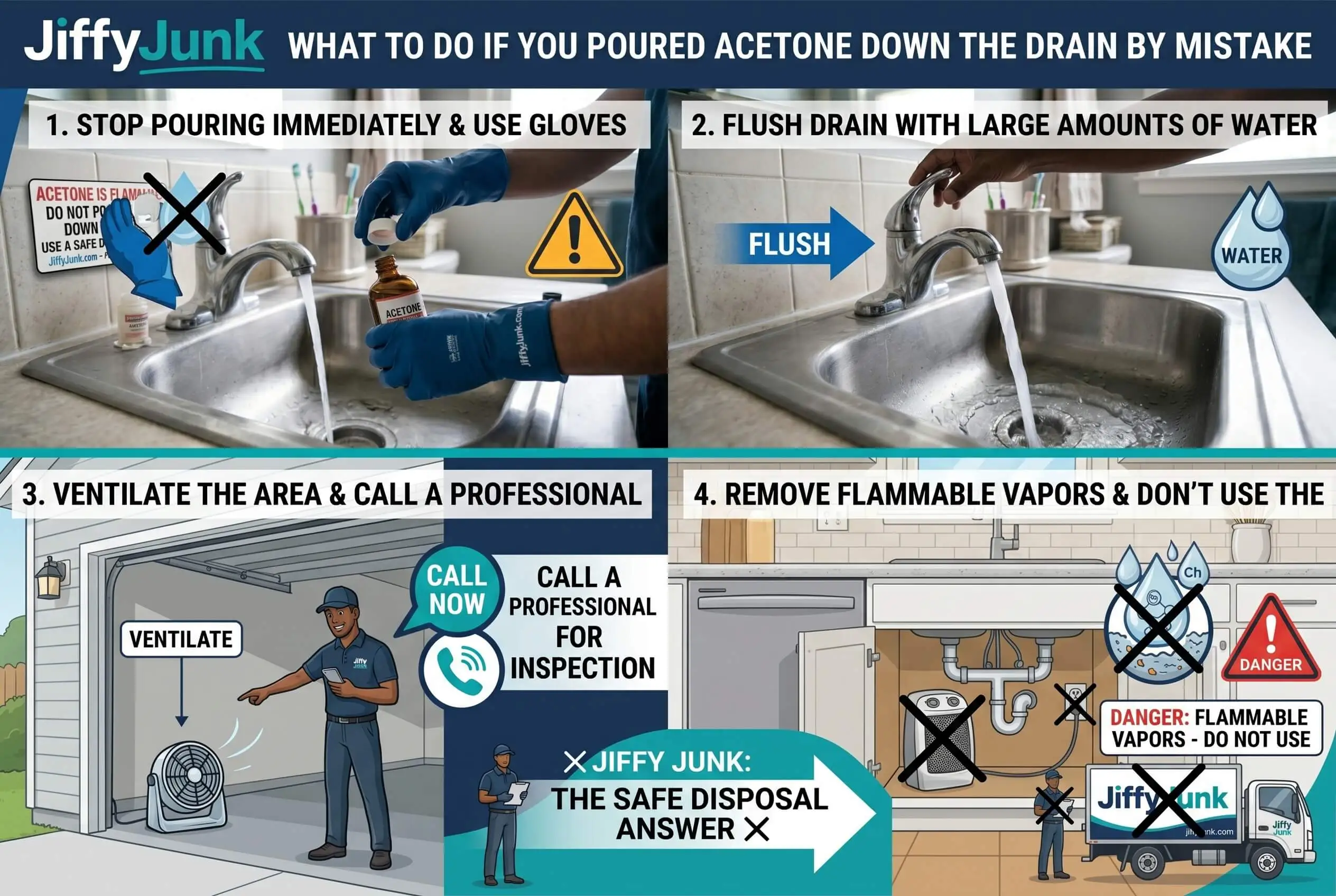 If the spill was more than a cup, or fumes don't clear after 30 minutes of active ventilation, the situation has moved past DIY. For homeowners asking can you pour acetone down the sink, the Jiffy Junk full guide covers the disposal options most people don't know exist.